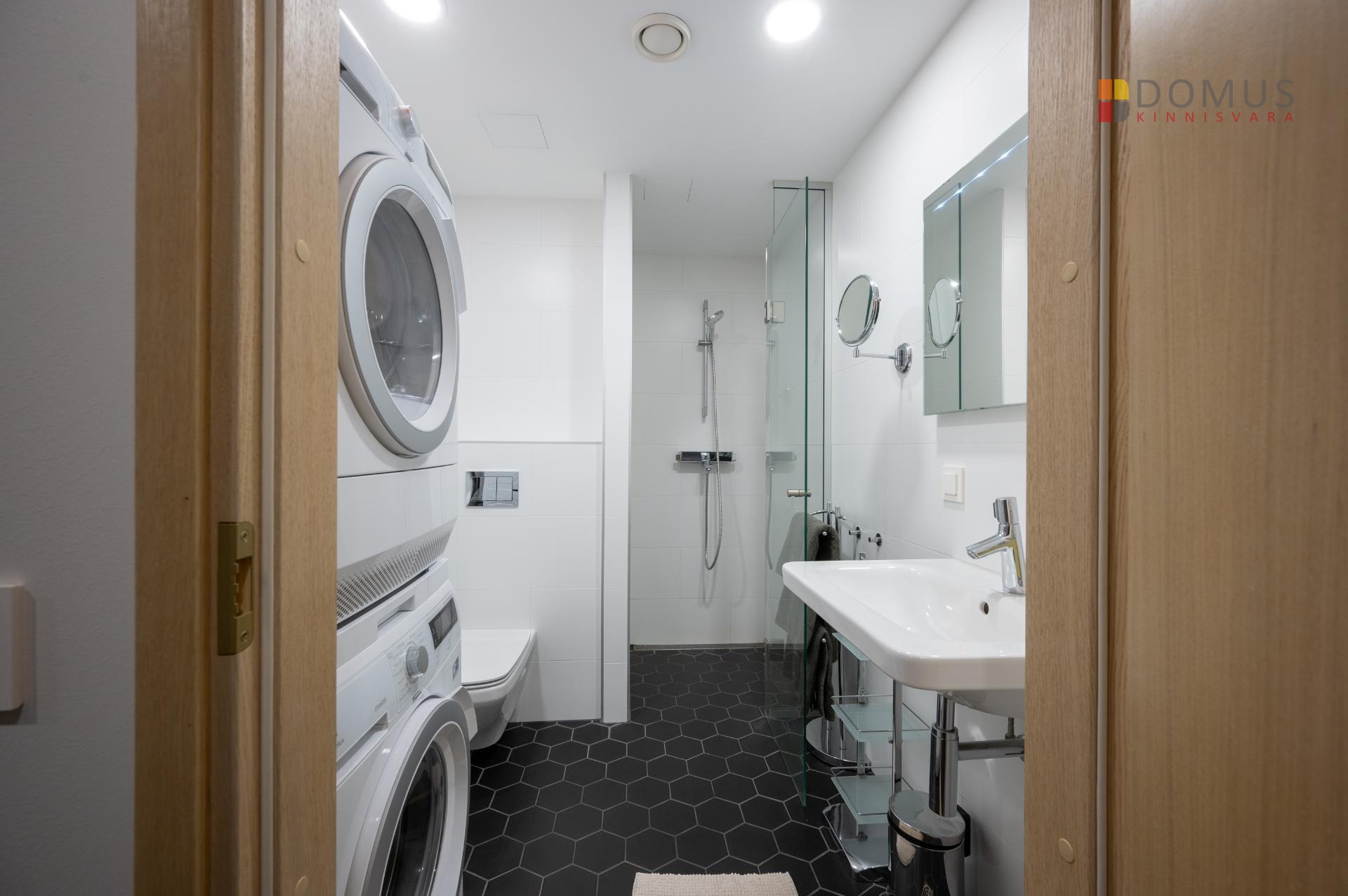 Душевая и туалет оформлены в светло-бежевых тонах с керамической плиткой из натурального камня и оборудованы качественной сантехникой Electrolux. Также установлены стиральная машина и сушильный автомат, а дополнительный комфорт обеспечивает электрический подогрев пола.