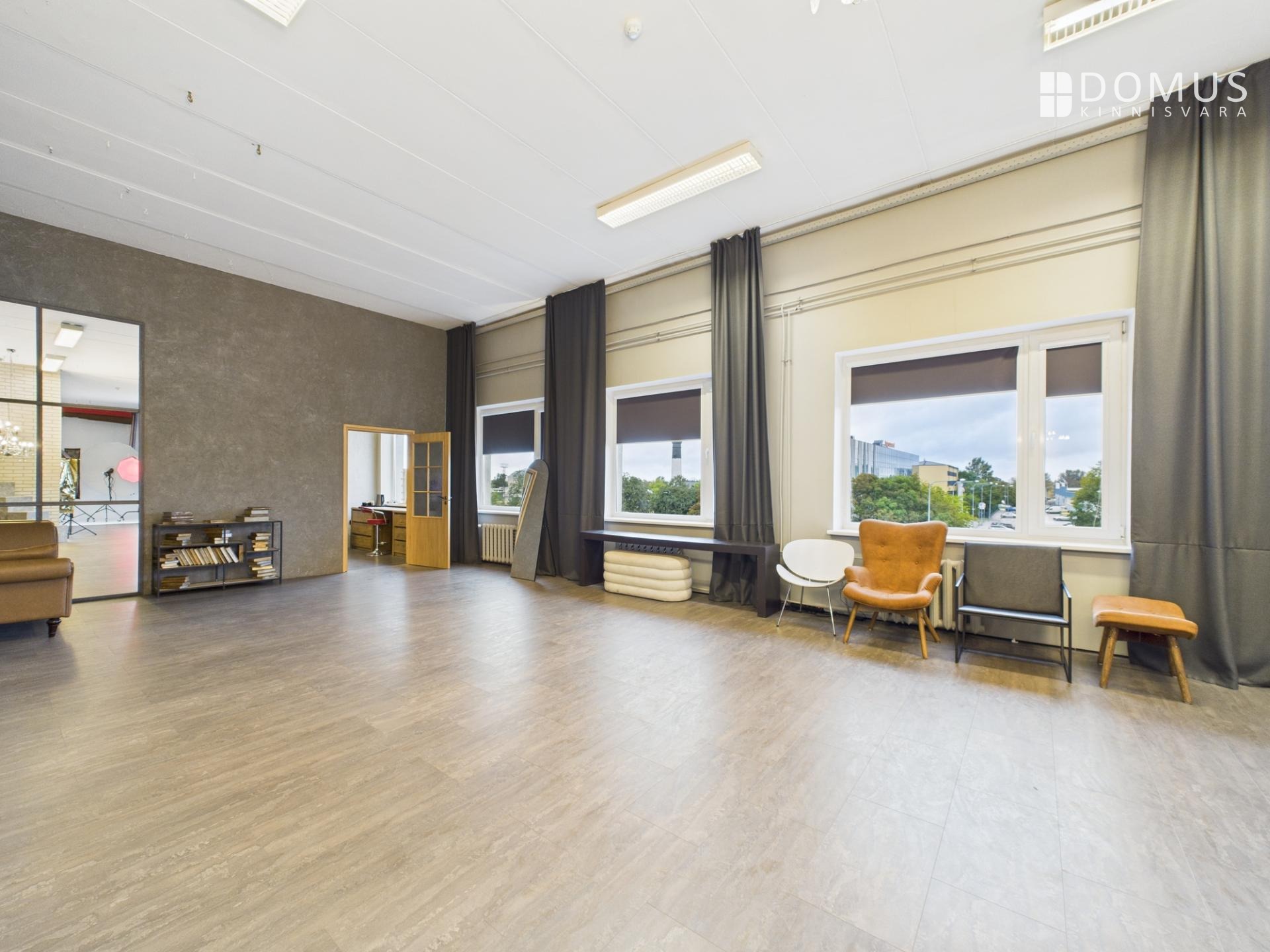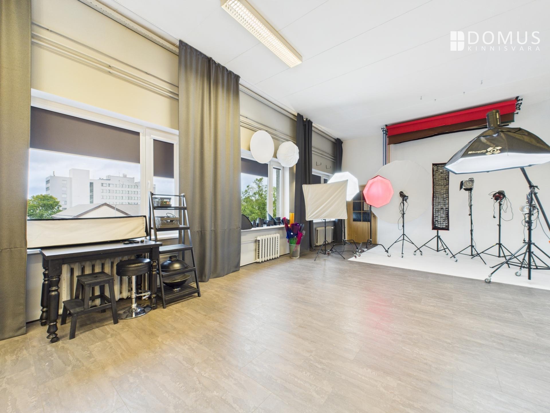 На окнах установлены шторы и черные руло, что позволяет полностью затемнить студию.
