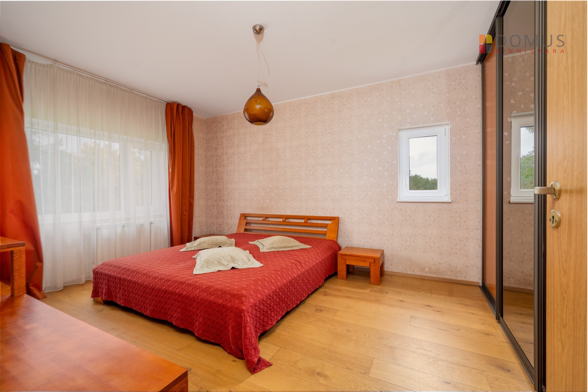 Недвижимость окружена со всех сторон садом. Деревянный забор был свежепокрашен. Между двумя частями дома есть живая изгородь. В саду растут цветы, сирень, сосны и дубы. Перед домом вы можете пройти по слабому движению к автобусной остановке, магазину, школе и детскому саду.
