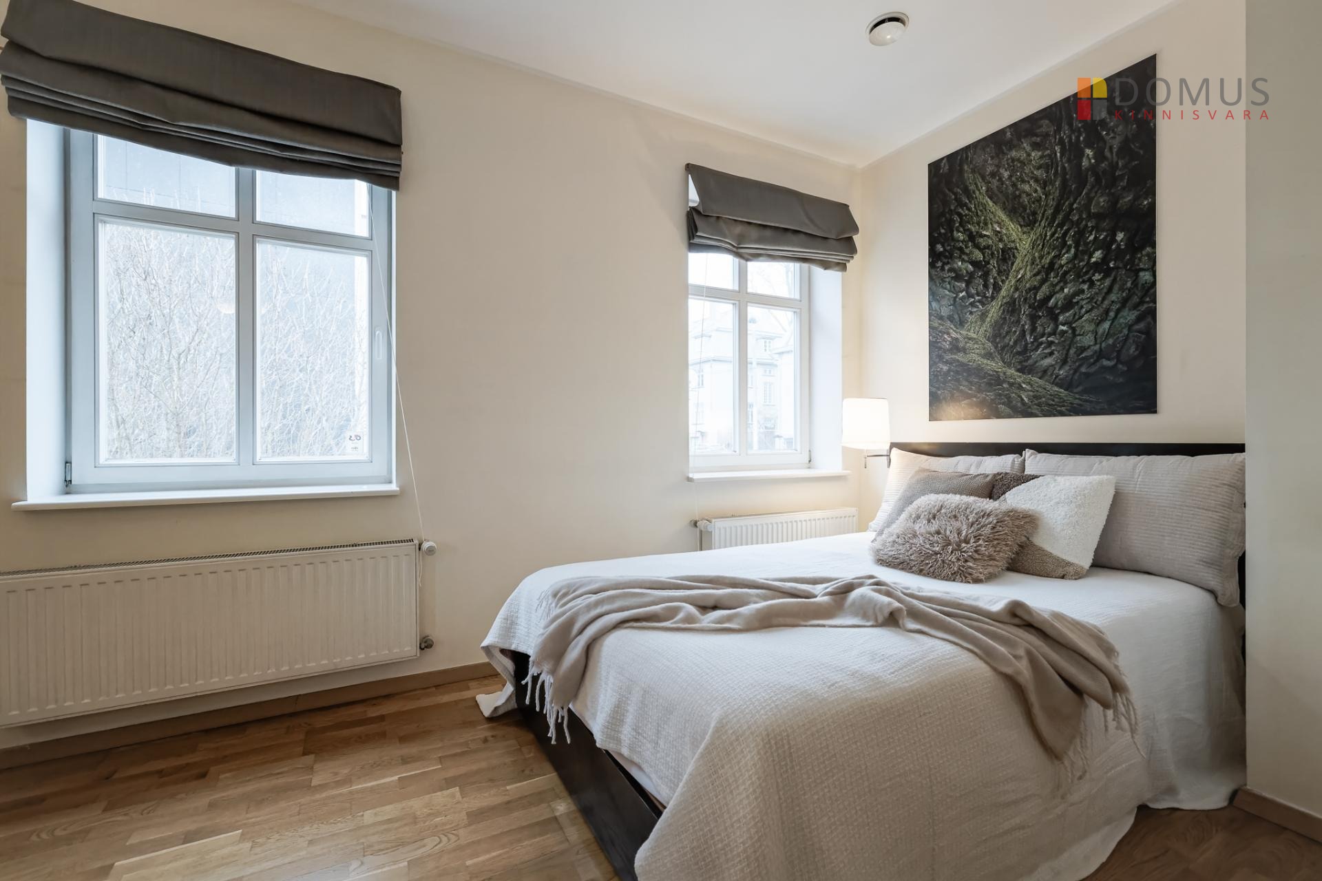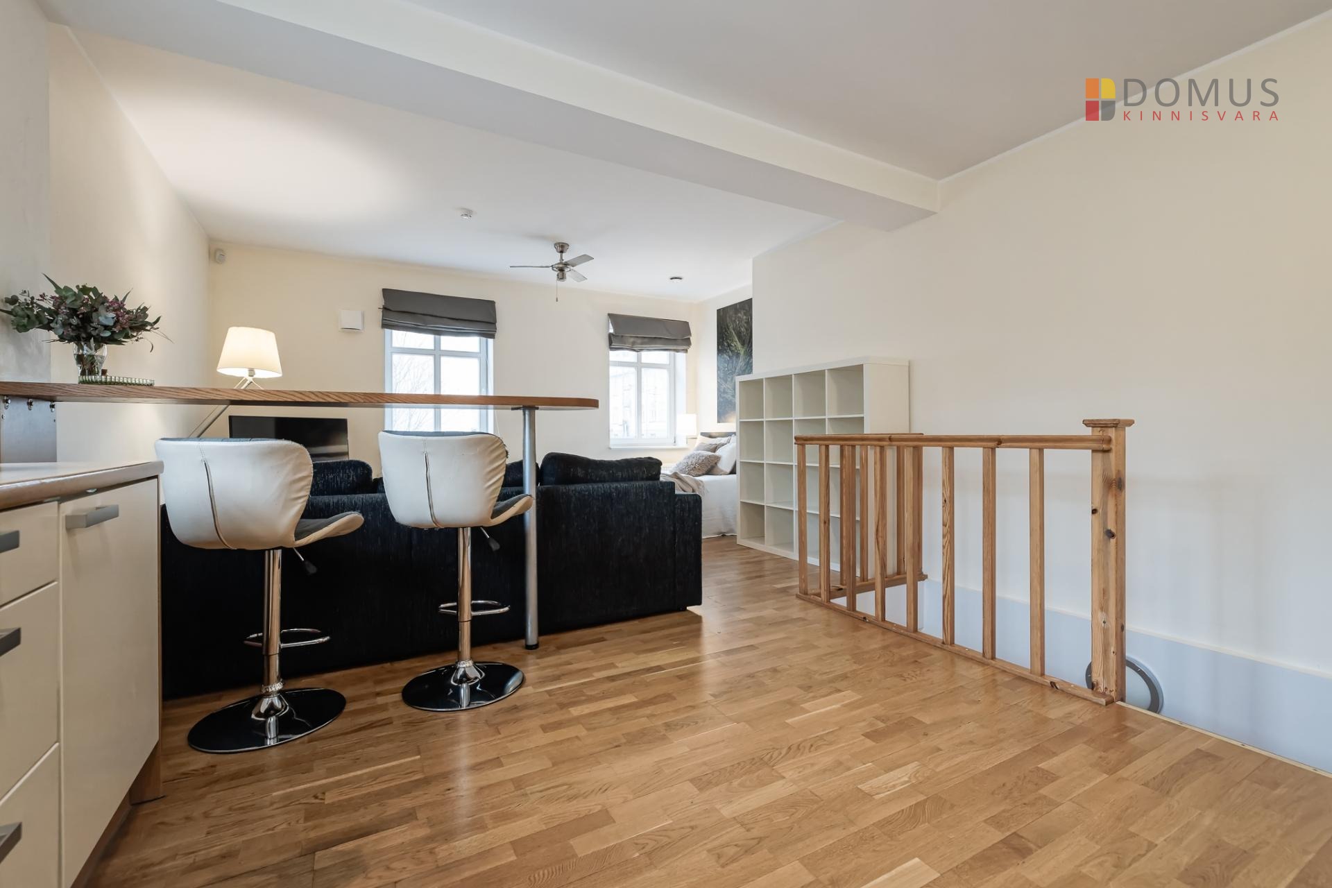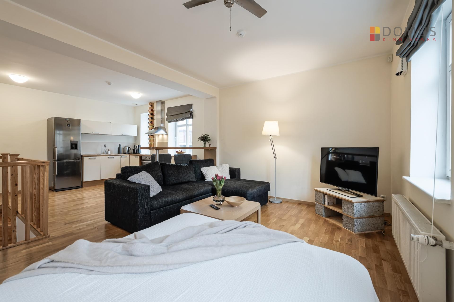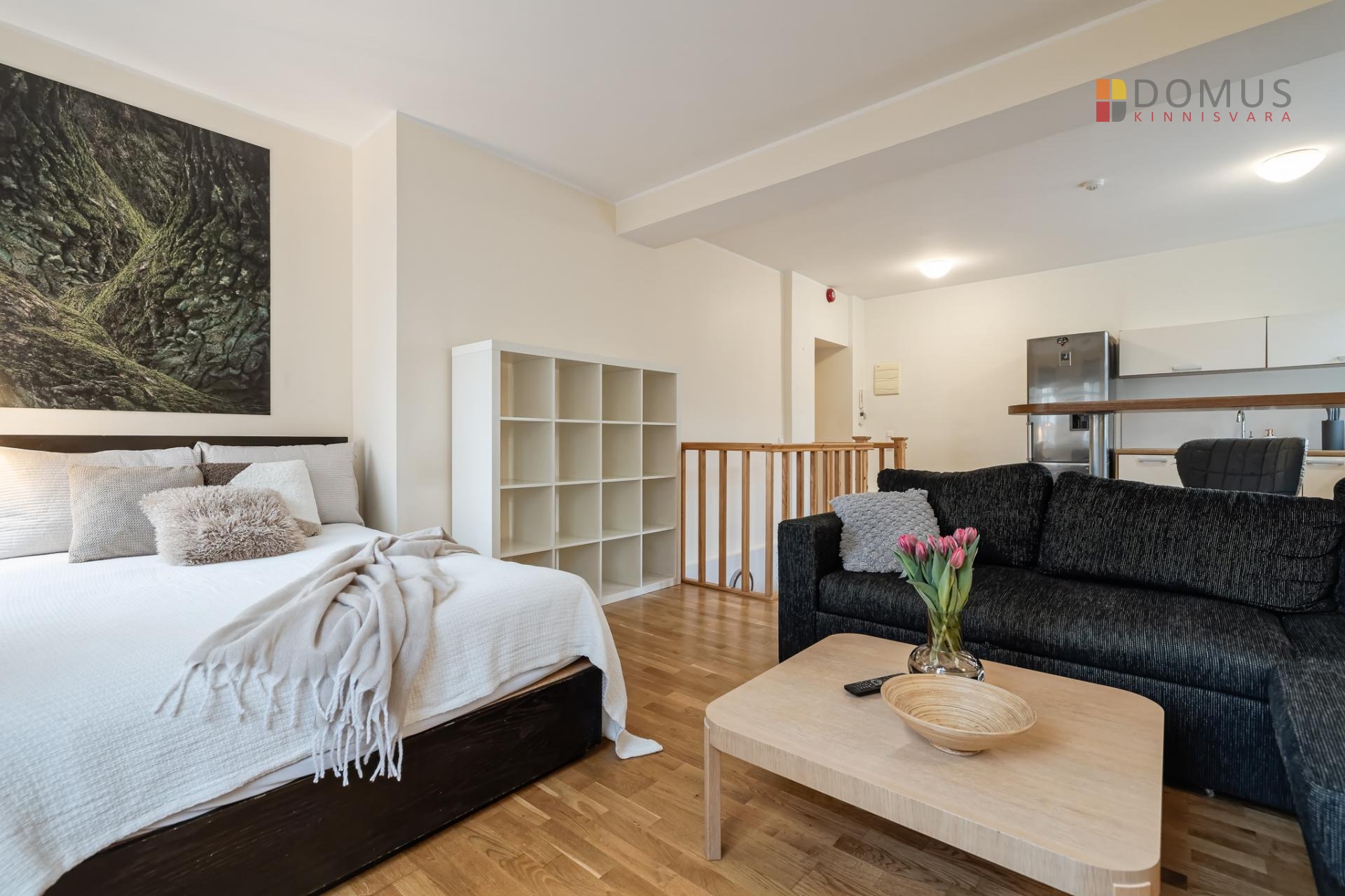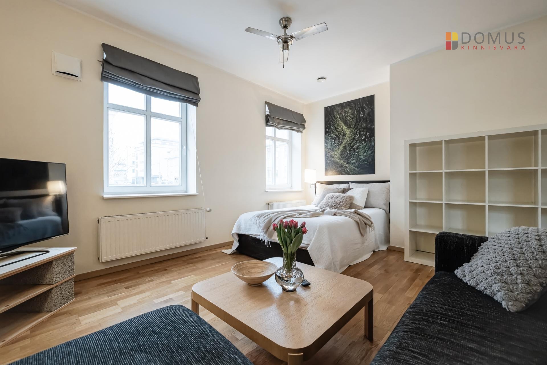 Квартира представляет собой исключительно просторную 1-комнатную жилплощадь, которую легко можно преобразовать в 2-комнатную. В углу гостиной, где сейчас стоит кровать, можно отделить спальню с окном, в которой также поместится гардеробный шкаф. Альтернативно, зону отдыха можно частично разделить с помощью мебели.