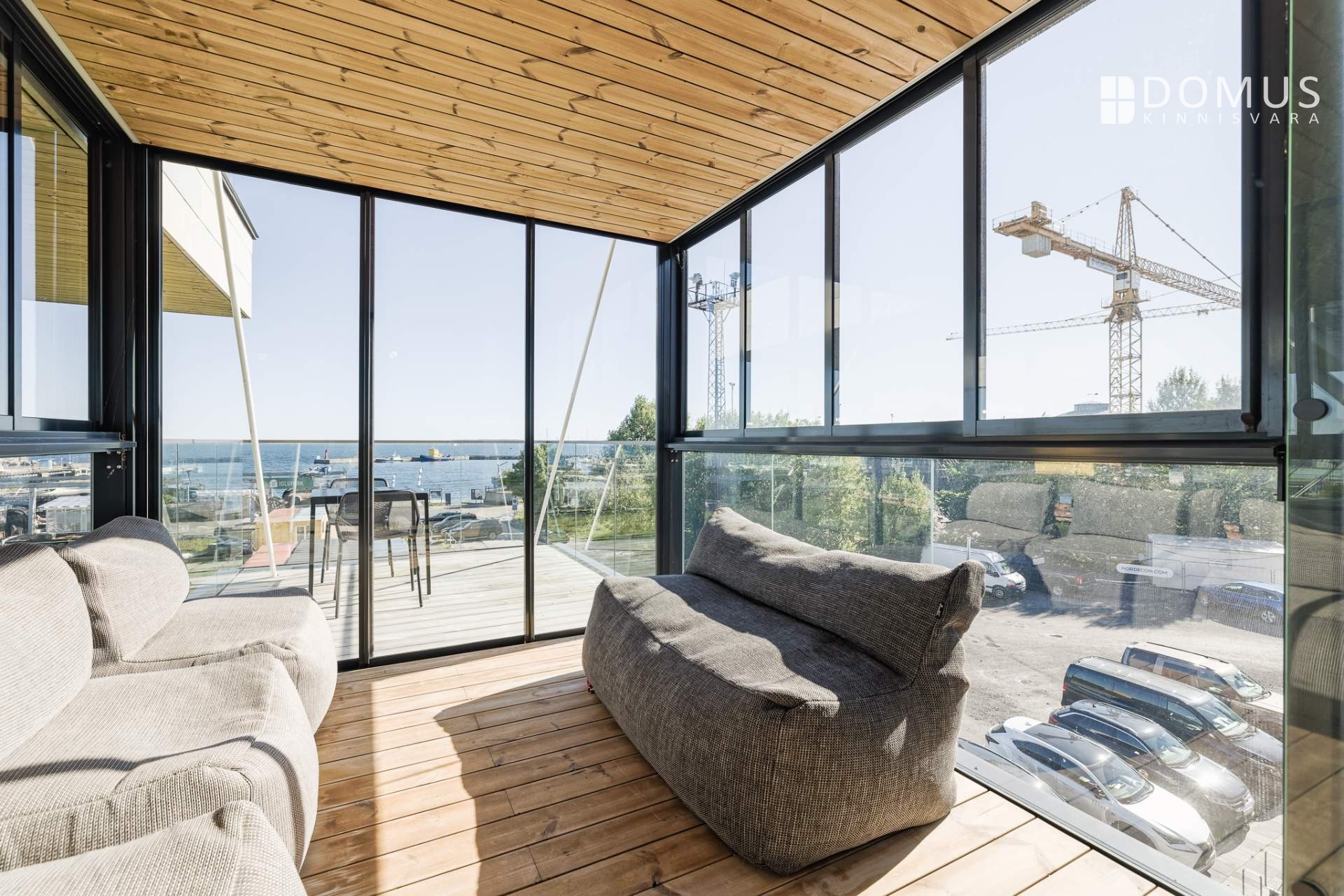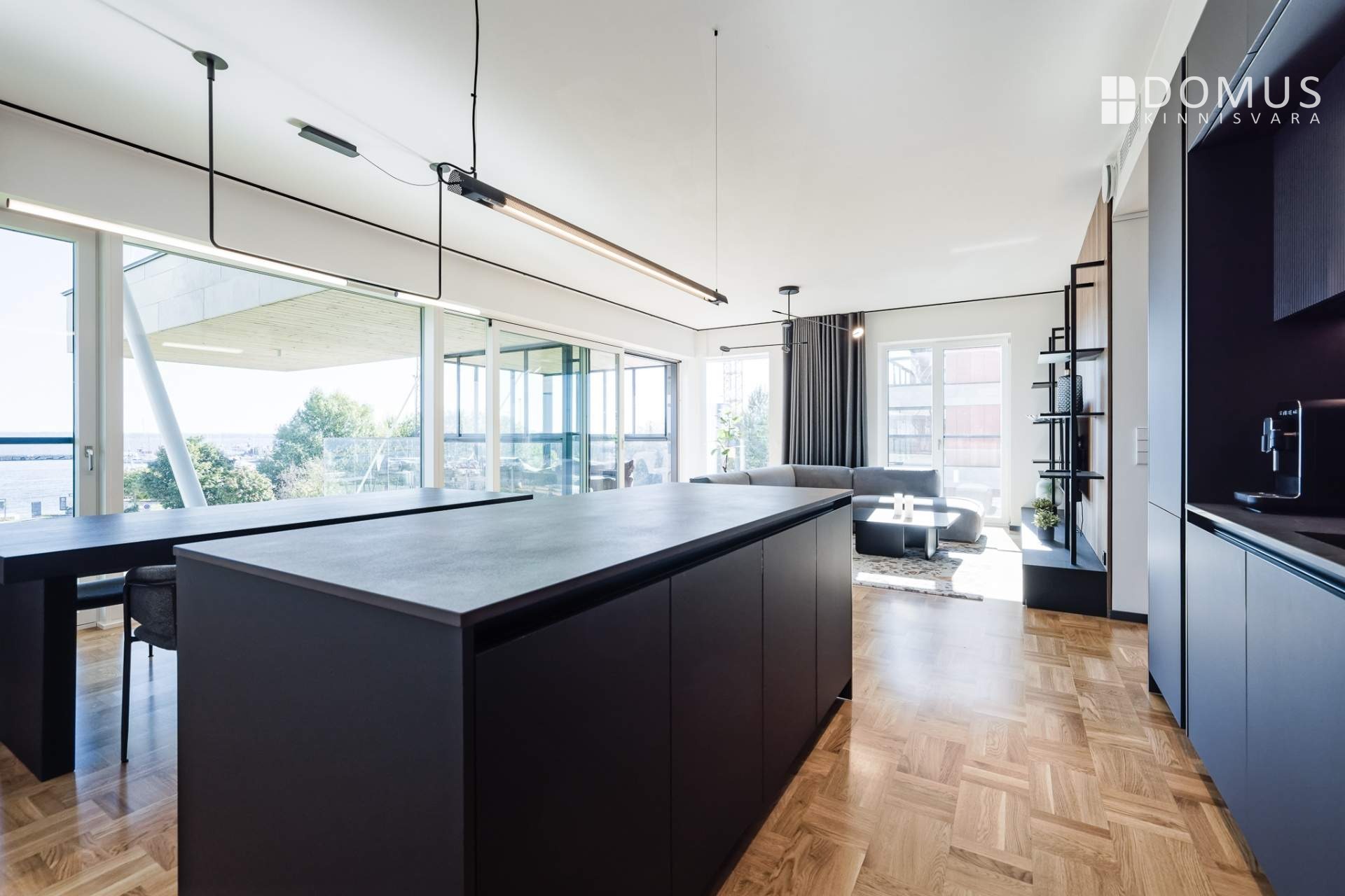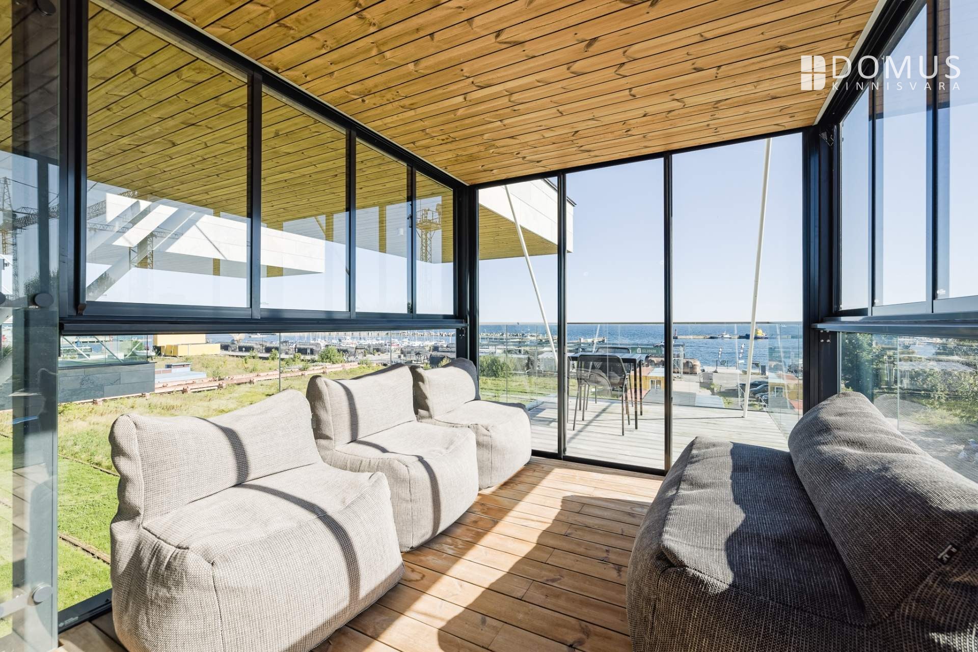 Гостиная с видом на район порта Ноблесснер и море имеет выход на балкон, который частично открыт, а частично застеклен, что позволяет использовать это пространство круглый год.