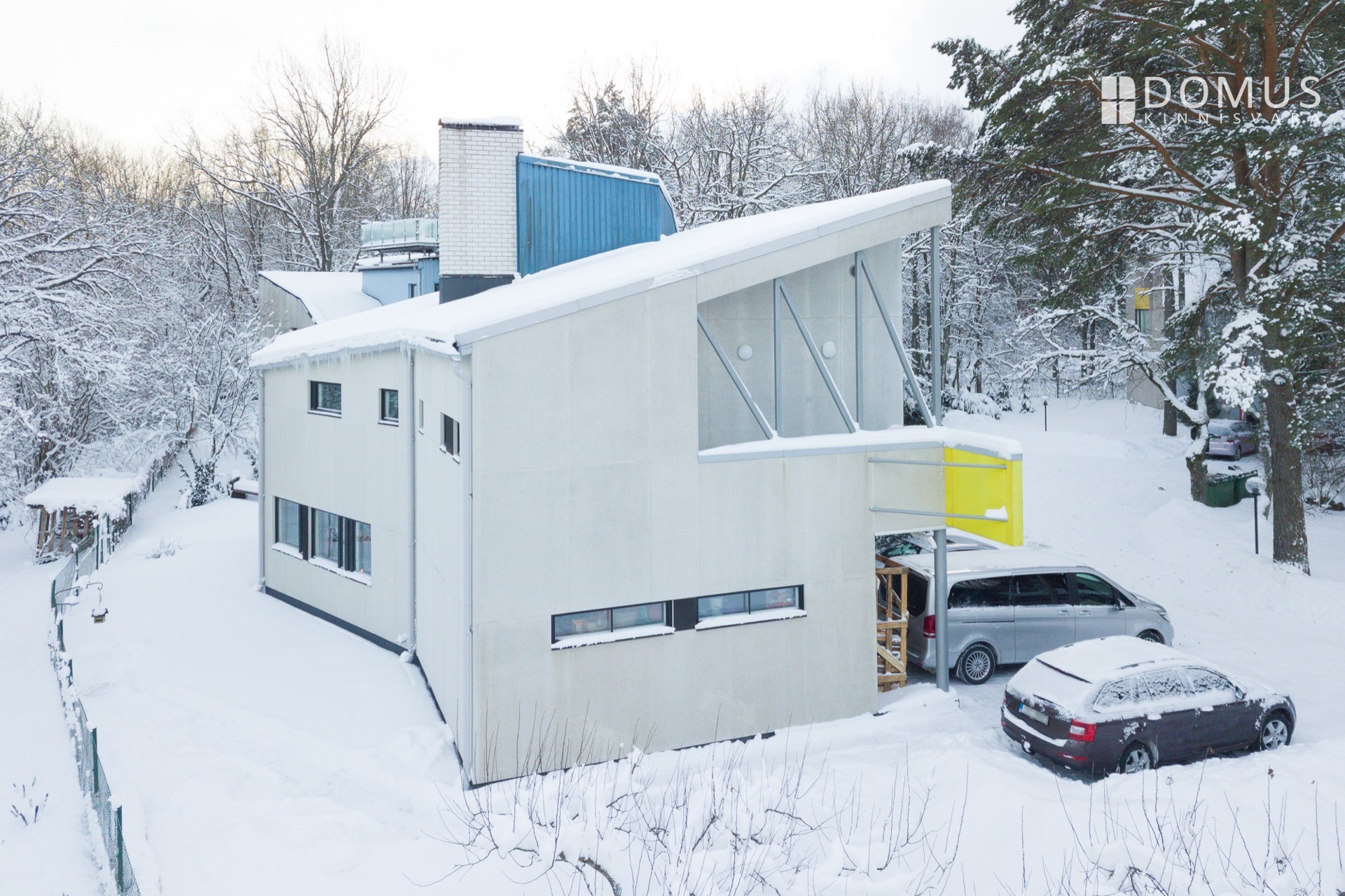 Дом спроектирован компанией Künnapu & Padrik AS, а архитектором интерьера является Ардо Куккасниеми. Дом является огнестойким зданием, что означает, что все несущие части здания имеют класс огнестойкости не ниже B-30. На наружной стене это достигается путем покрытия деревянного каркаса полимербетоном (Steni) снаружи и гипсокартоном внутри. Перегородки стоят на деревянных балках, заполненных каменной ватой и обшитых снизу гипсокартоном. Дымоход сложен из обожженного полнотелого кирпича. Кровля выполнена из высококачественных рулонов, заменена 7 лет назад. Окна представляют собой 3X стеклопакет с деревянными алюминиевыми рамами и 2X стеклопакет и 1 стекло с вентиляционными жалюзи. Отопление обеспечивается электрическими радиаторами, двумя тепловыми насосами с воздушными источниками (Mitsubishi и Daikin, которые также охлаждают воздух при необходимости) и камином с каминным обогревателем в гостиной. Стоимость для самого холодного месяца зимы, включая как радиаторы, так и тепловые насосы, составляет около 300-400 евро. Летом расходы составляют порядка 100-200 евро. Электричество 3x25A. Вода поступает из скважины и нагревается электрическим бойлером на 300 л. Дом оборудован системой центрального пылесоса Puzer и механической вентиляцией. Подключение к Интернету и телевидению обеспечивается компанией Telia. Установлена система безопасности, которая также может контролироваться на каждом этаже.