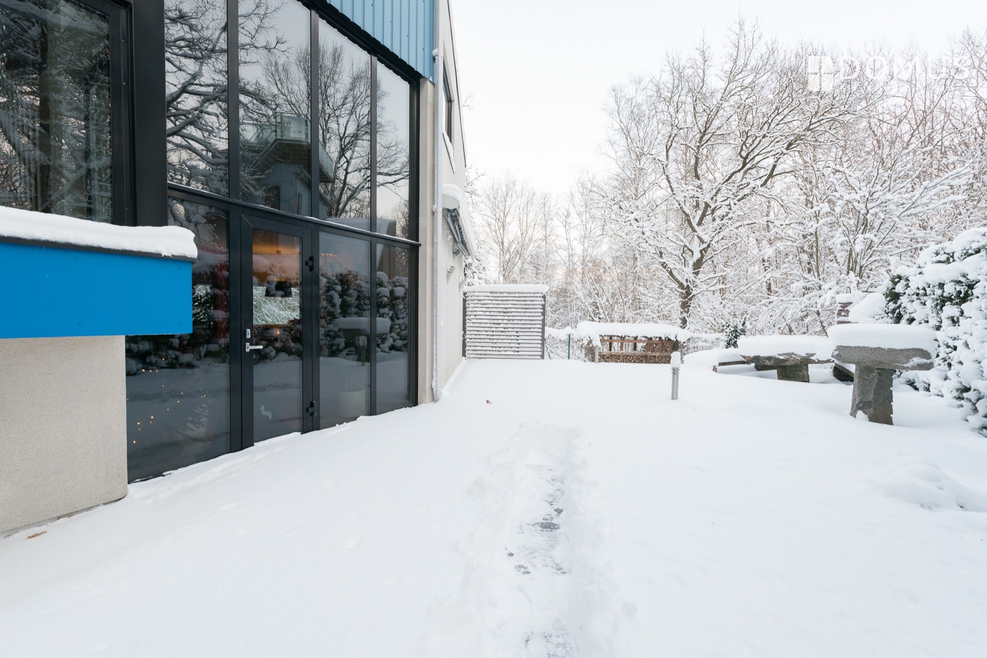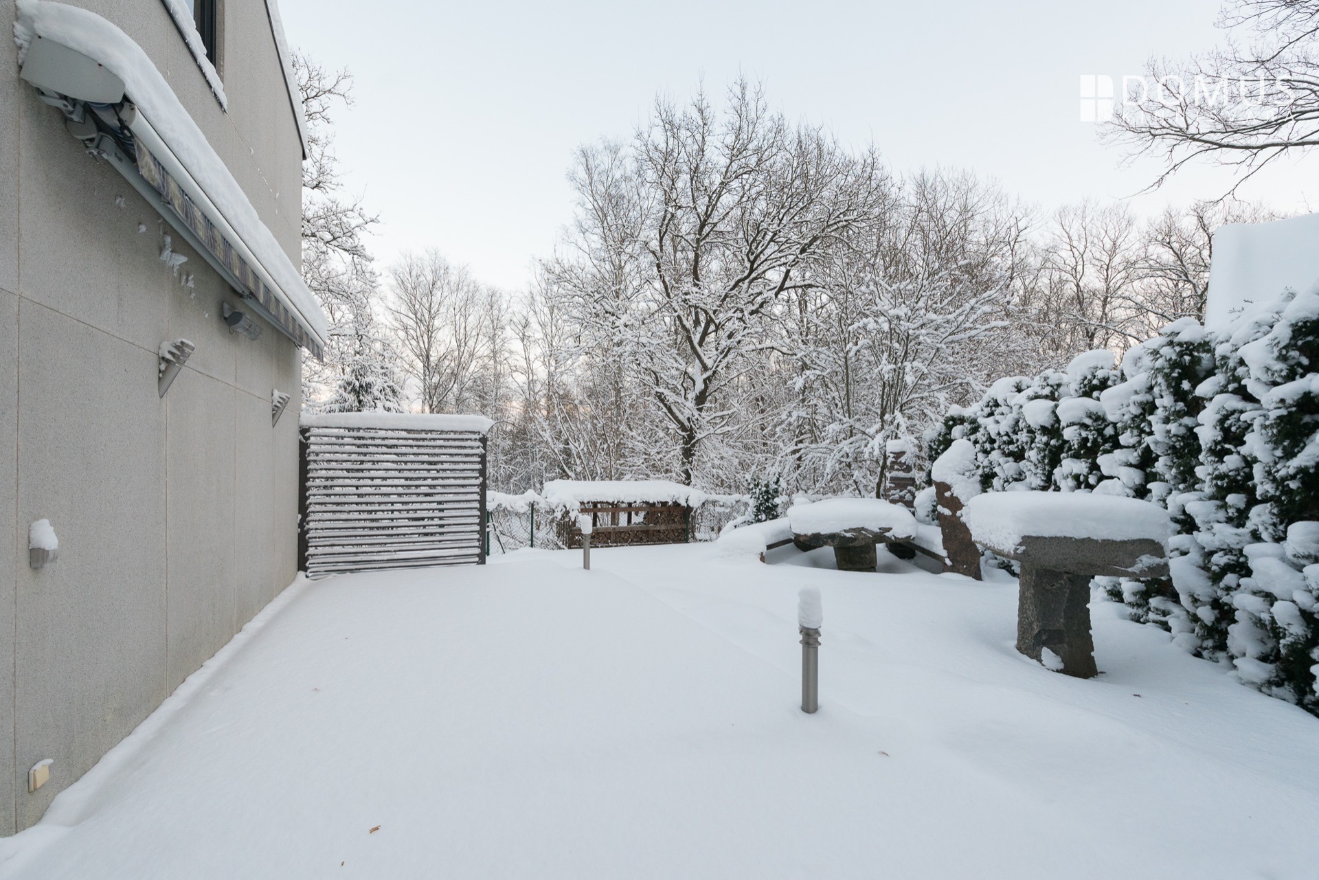 Детальный план всей территории был составлен архитектурным бюро Künnapu & Padrik AS. Всего на участке расположено девять отдельно стоящих домов, которые обнесены забором и поэтому обеспечивают безопасную среду проживания для детей. Участок озеленен и с одной стороны засажен живыми деревьями. С другой стороны дома растут яблони и ягодные кусты (тиккер, черная и красная смородина). Газон в саду подстригается бесшумной роботизированной косилкой Husqvarna. Перед домом есть брусчатая дорожка, достаточно просторная для нескольких автомобилей. Терраса с боковой стороны дома освещается утренним и дневным солнцем. На террасу можно выйти из гостиной, над ней установлен тент, а под ним - обогреватель. Рядом с террасой находится каменный стол и скамейки с твердой поверхностью, созданные Тауно Кангро.
