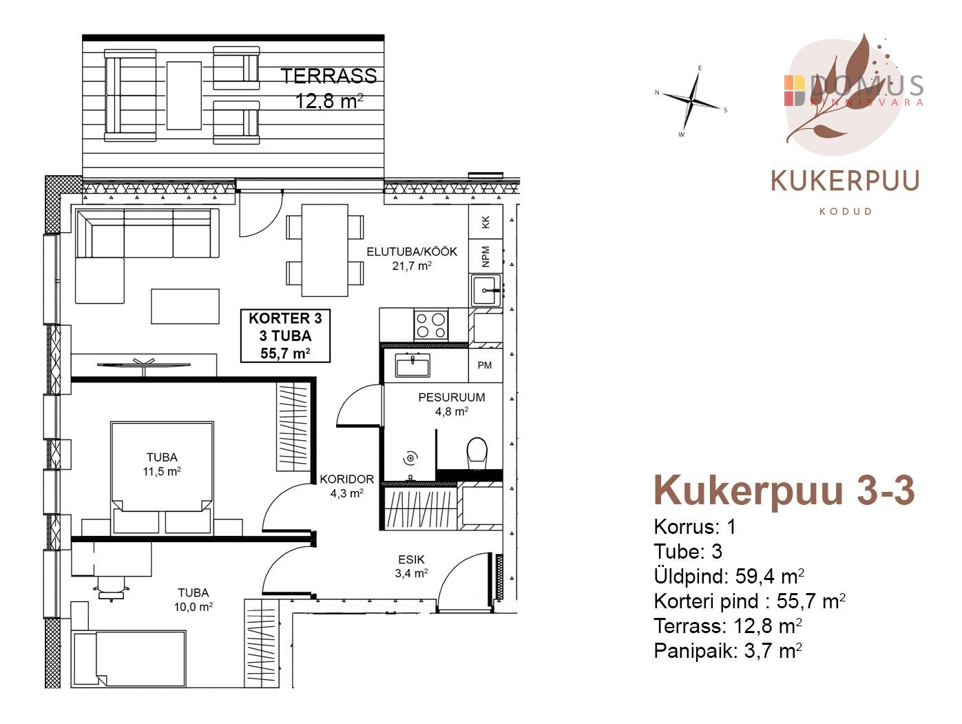 Продать квартира, 3 комната - Kukerpuu tn 3-3, Raadi-Kruusamäe, Tartu linn, Tartu linn, Tartu maakond
