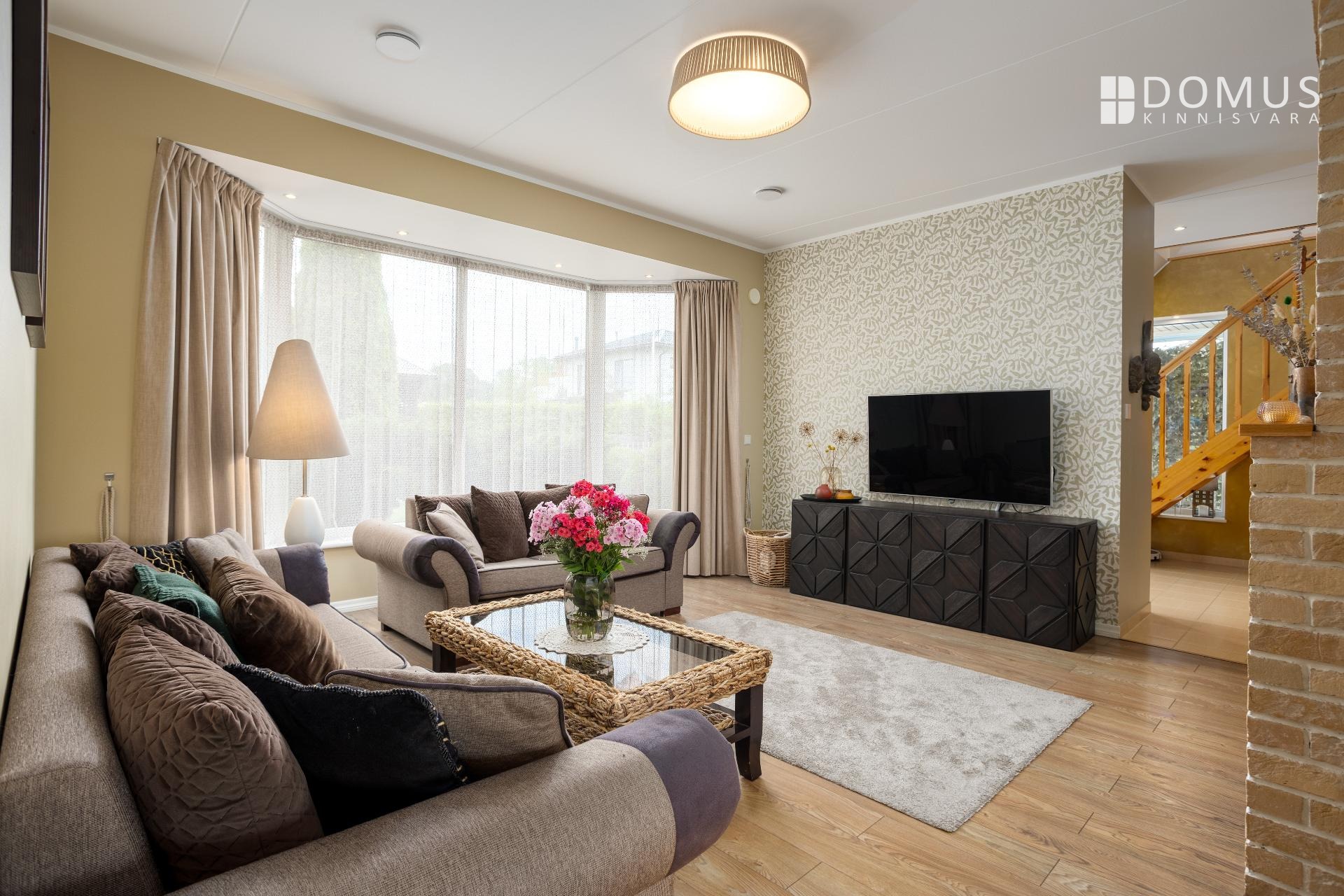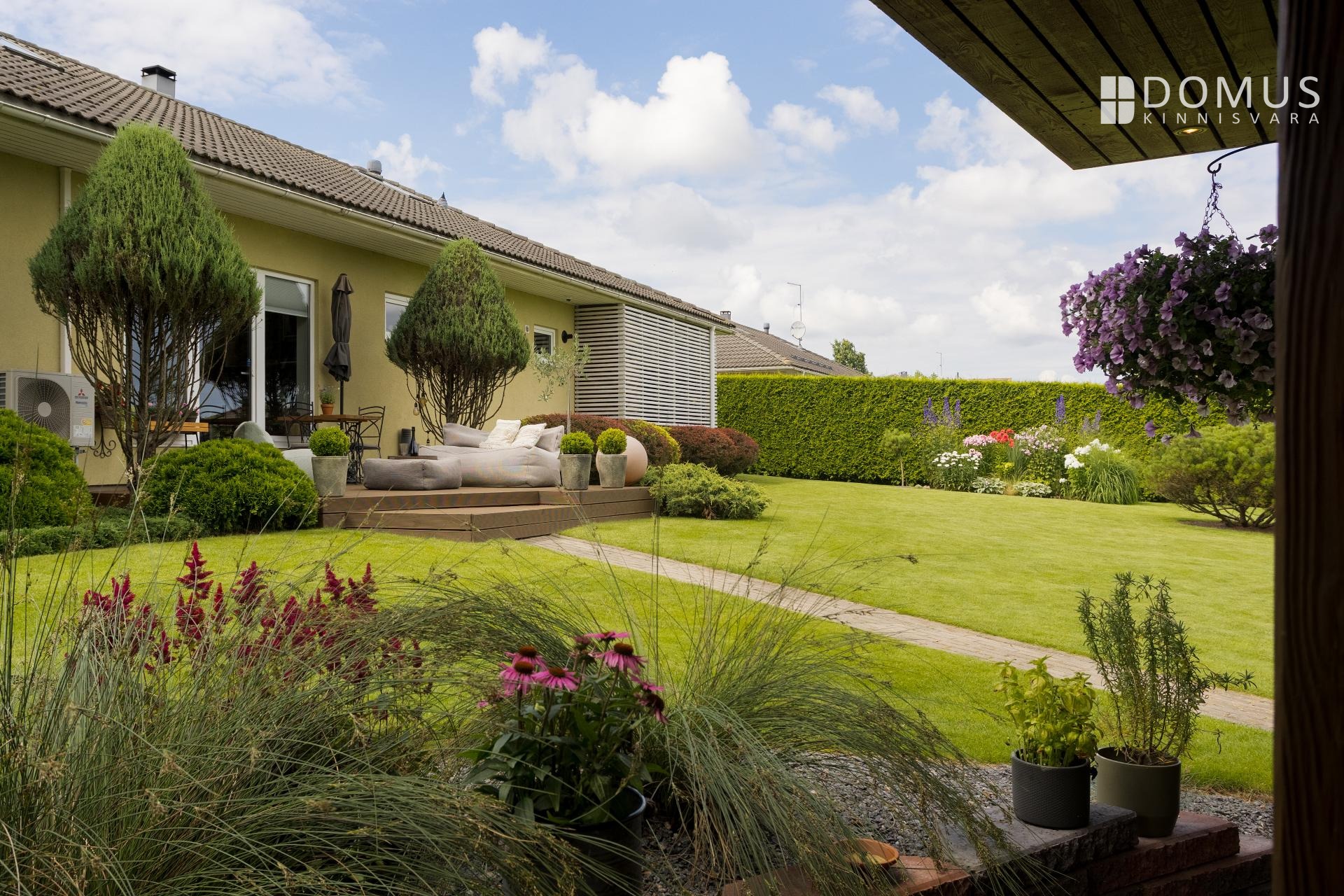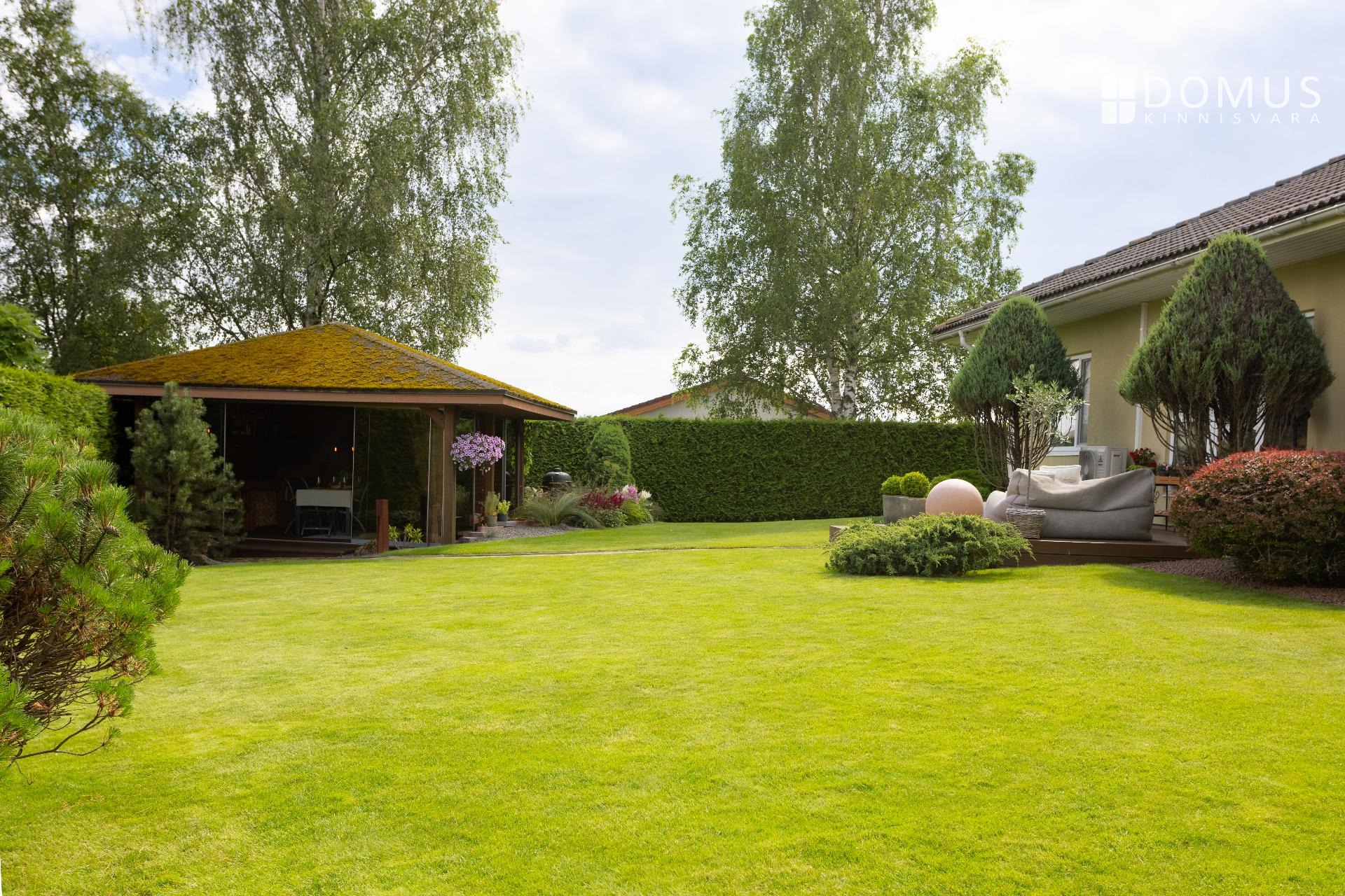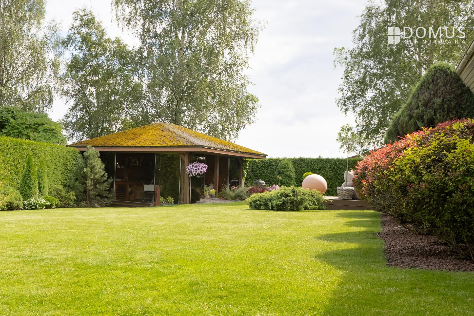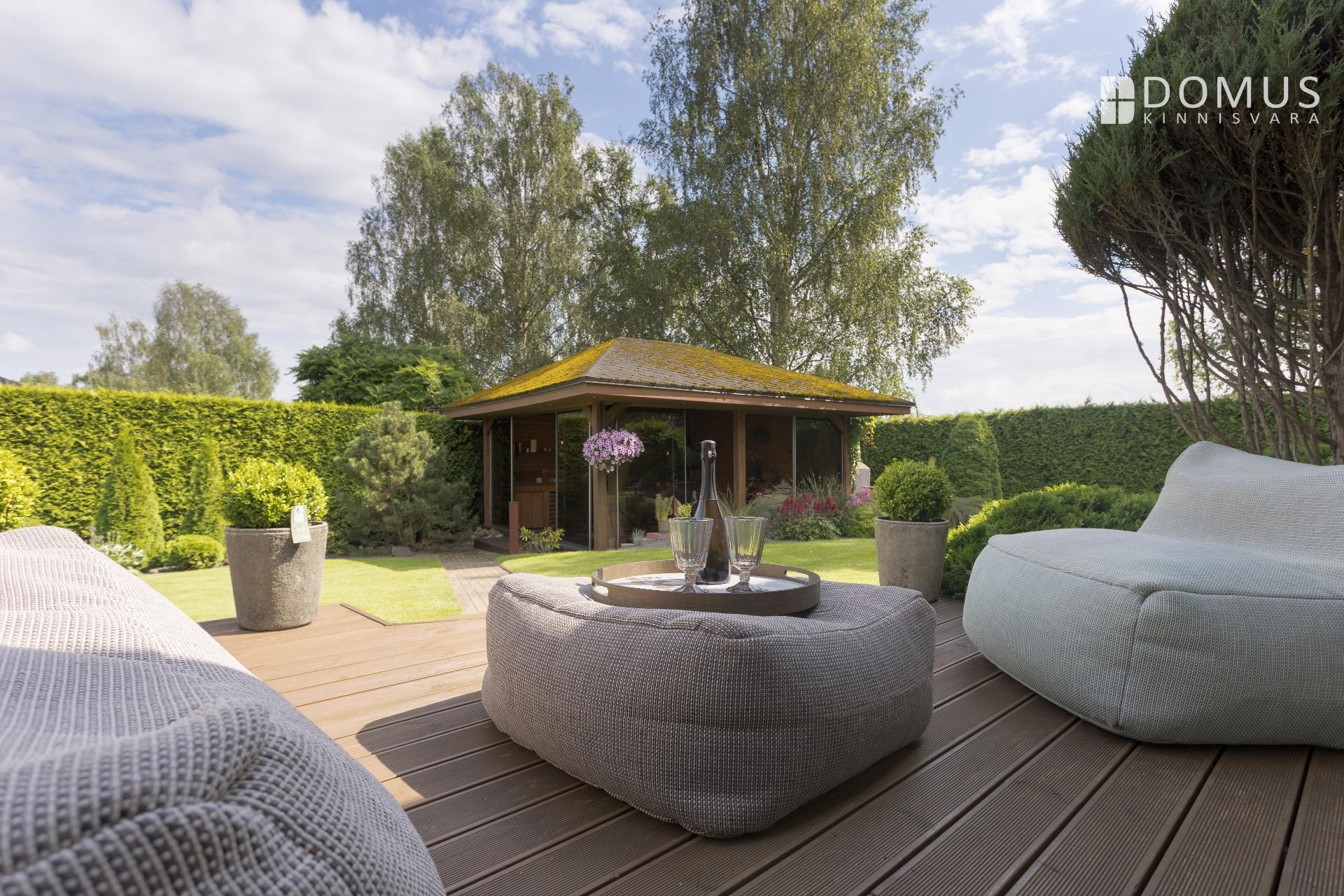 Дом построен в 2009 году, находится в хорошем состоянии и со временем получил необходимые обновления. Внутренняя отделка нейтральная и современная: в комнатах ламинированный паркет, стены в основном окрашены или оклеены обоями, в санузлах — керамическая плитка. Большие стеклопакеты пропускают много естественного света и подчёркивают простор дома. Ухоженный декоративный сад с садовым домиком и террасой создаёт приятную атмосферу как для семейной жизни, так и для приёма гостей.