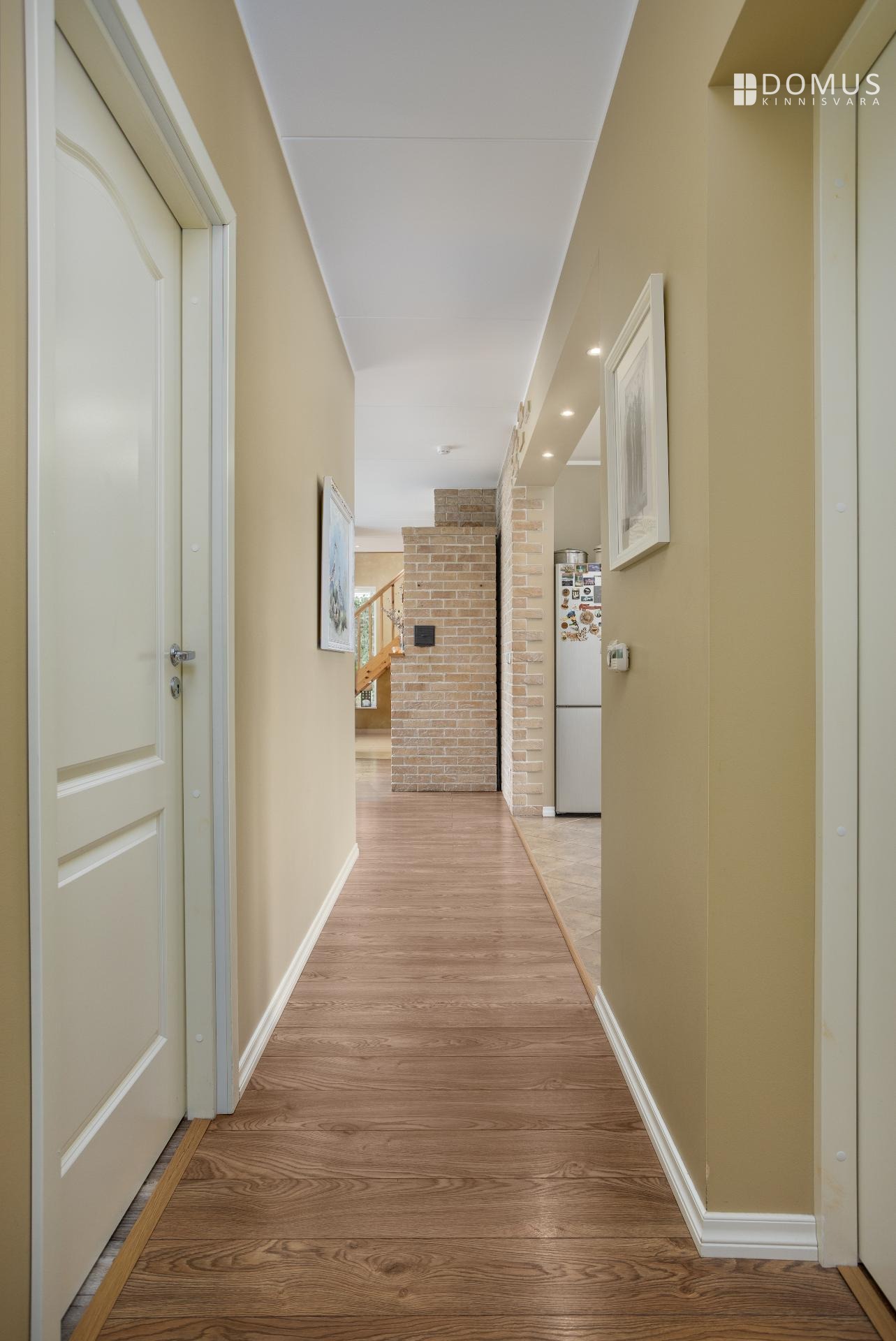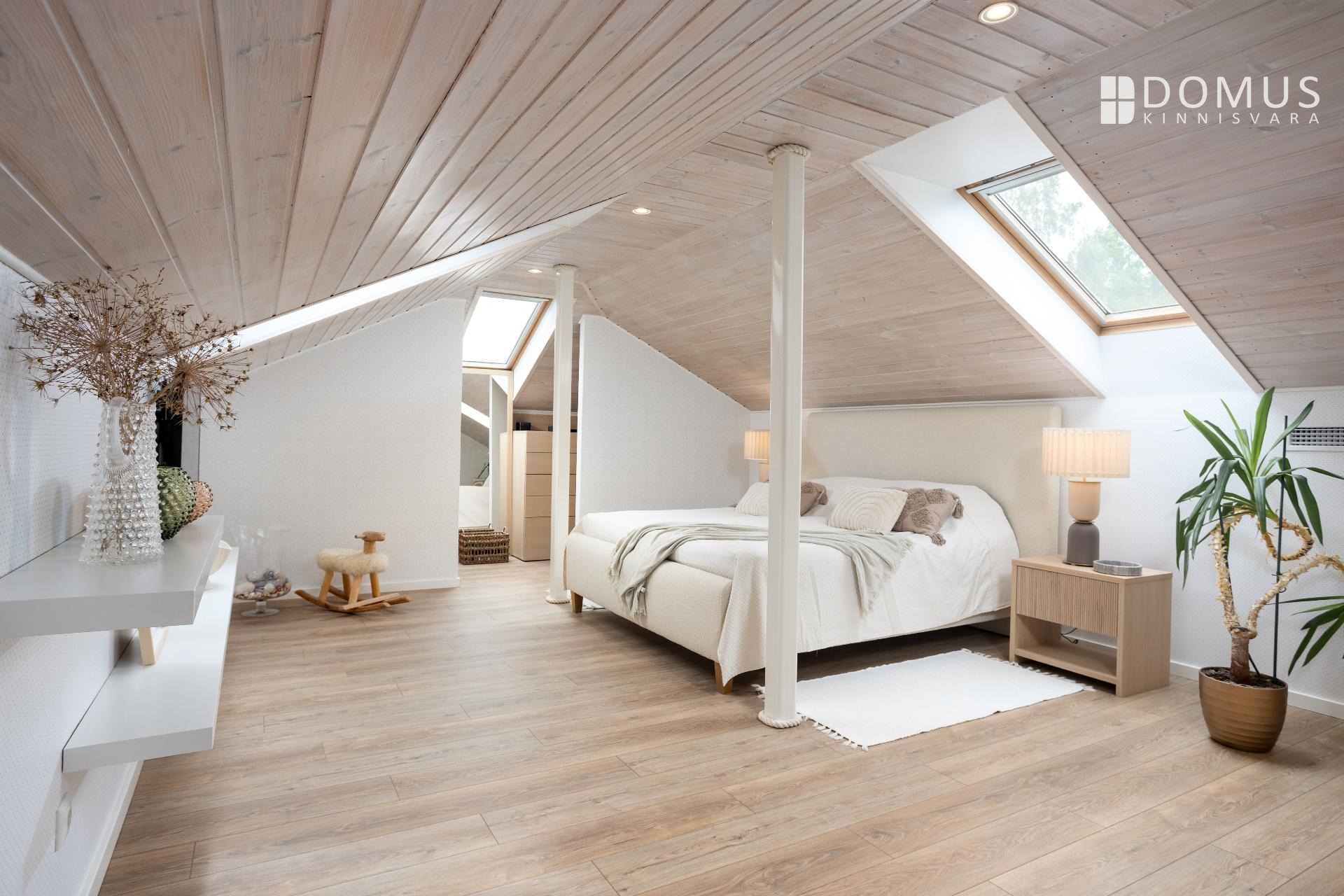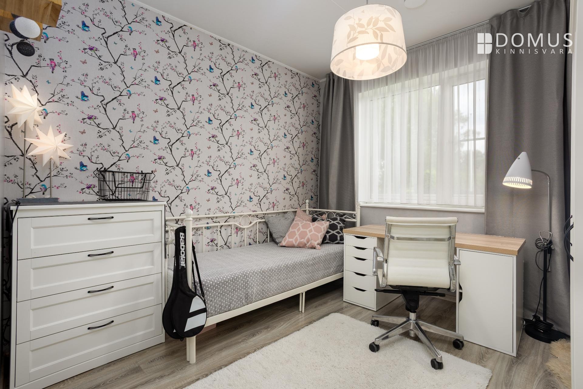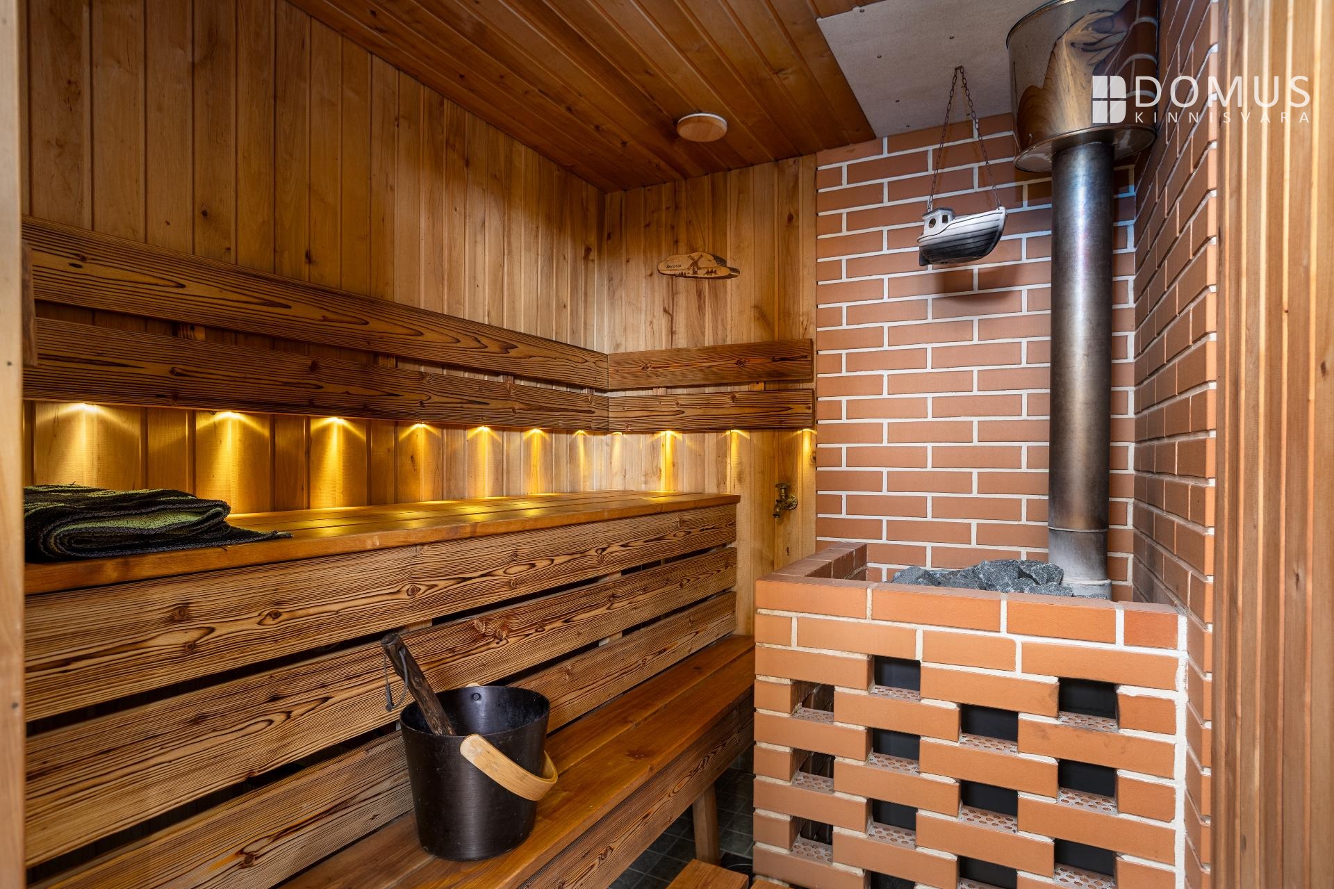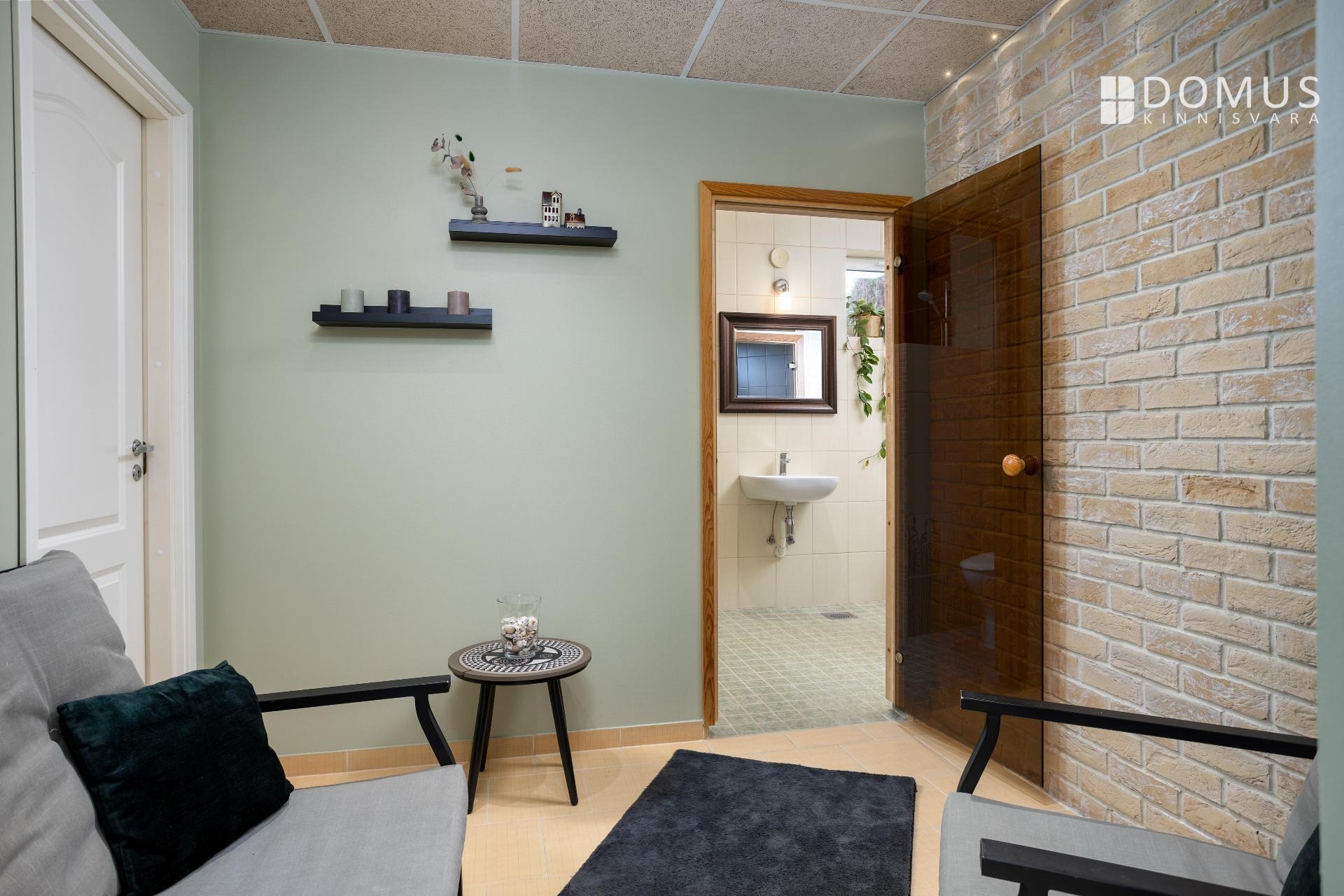 На этом же уровне расположены три спальни, сауна с душевой, отдельный WC, гараж и подсобные помещения. На втором этаже находится просторная спальня с гардеробной, уголок для кабинета и недавно обновлённая ванная комната с мансардным окном. Помещения светлые и обеспечивают достаточную приватность для всех членов семьи.
