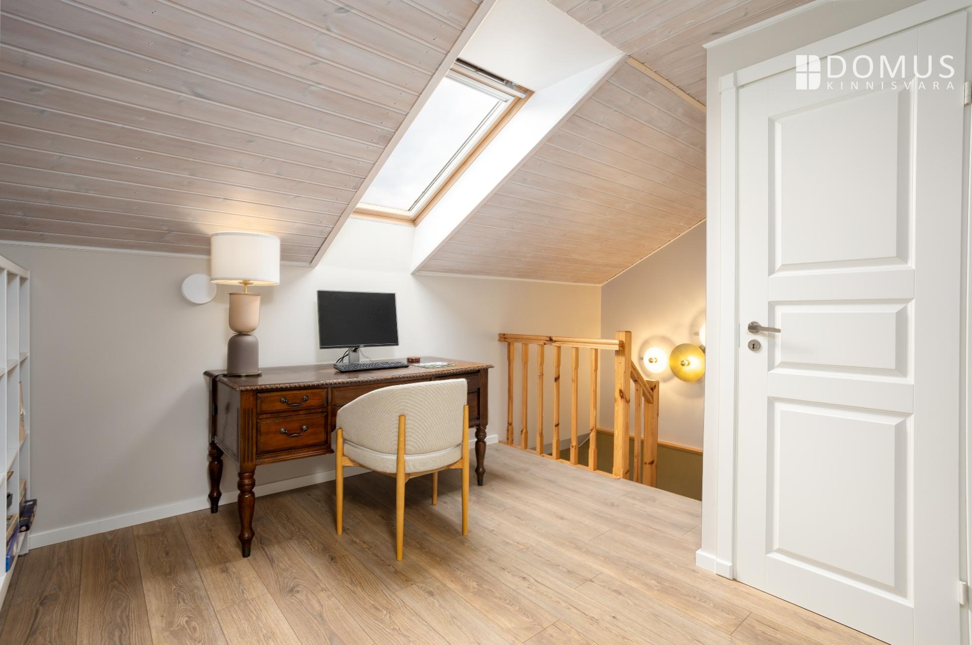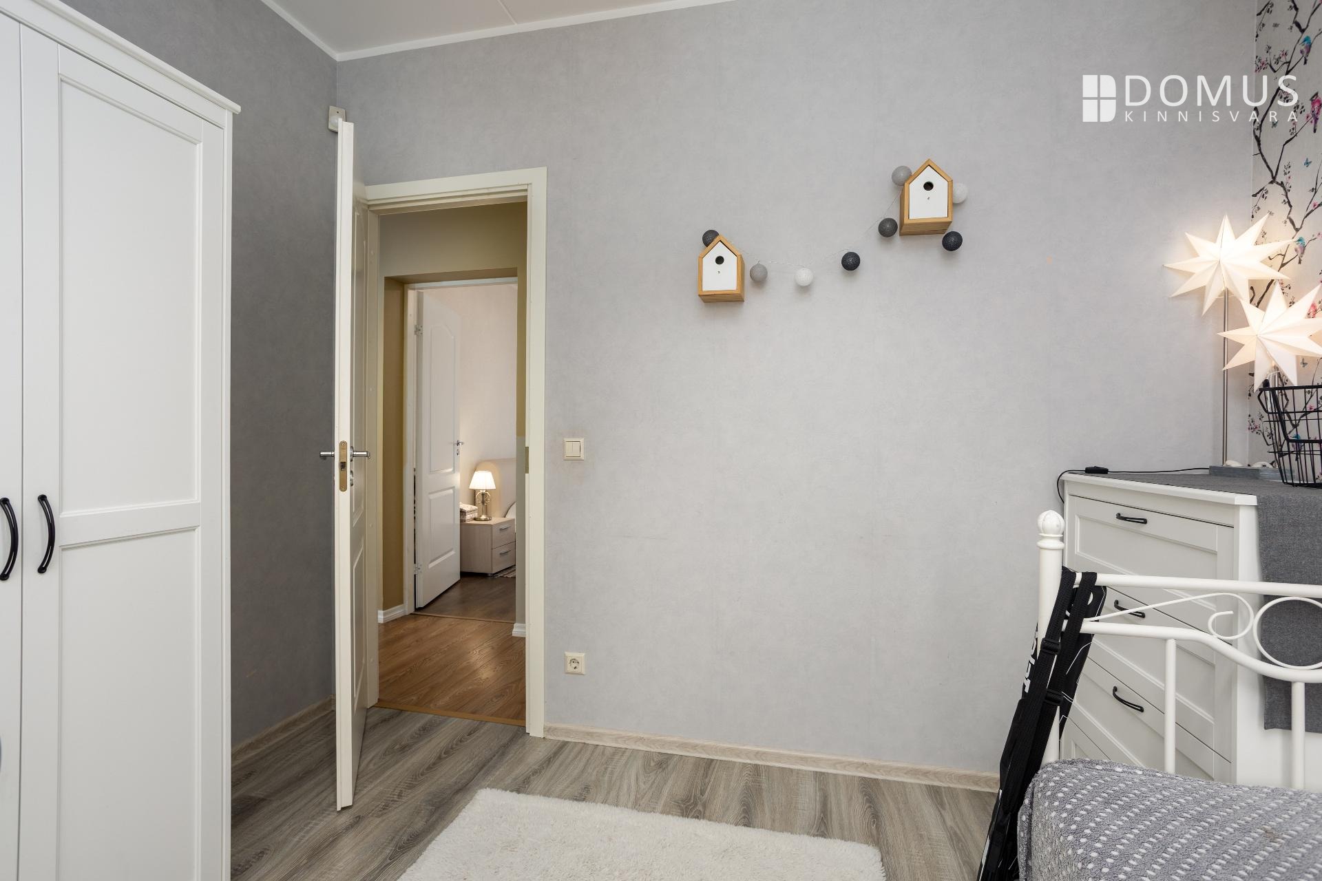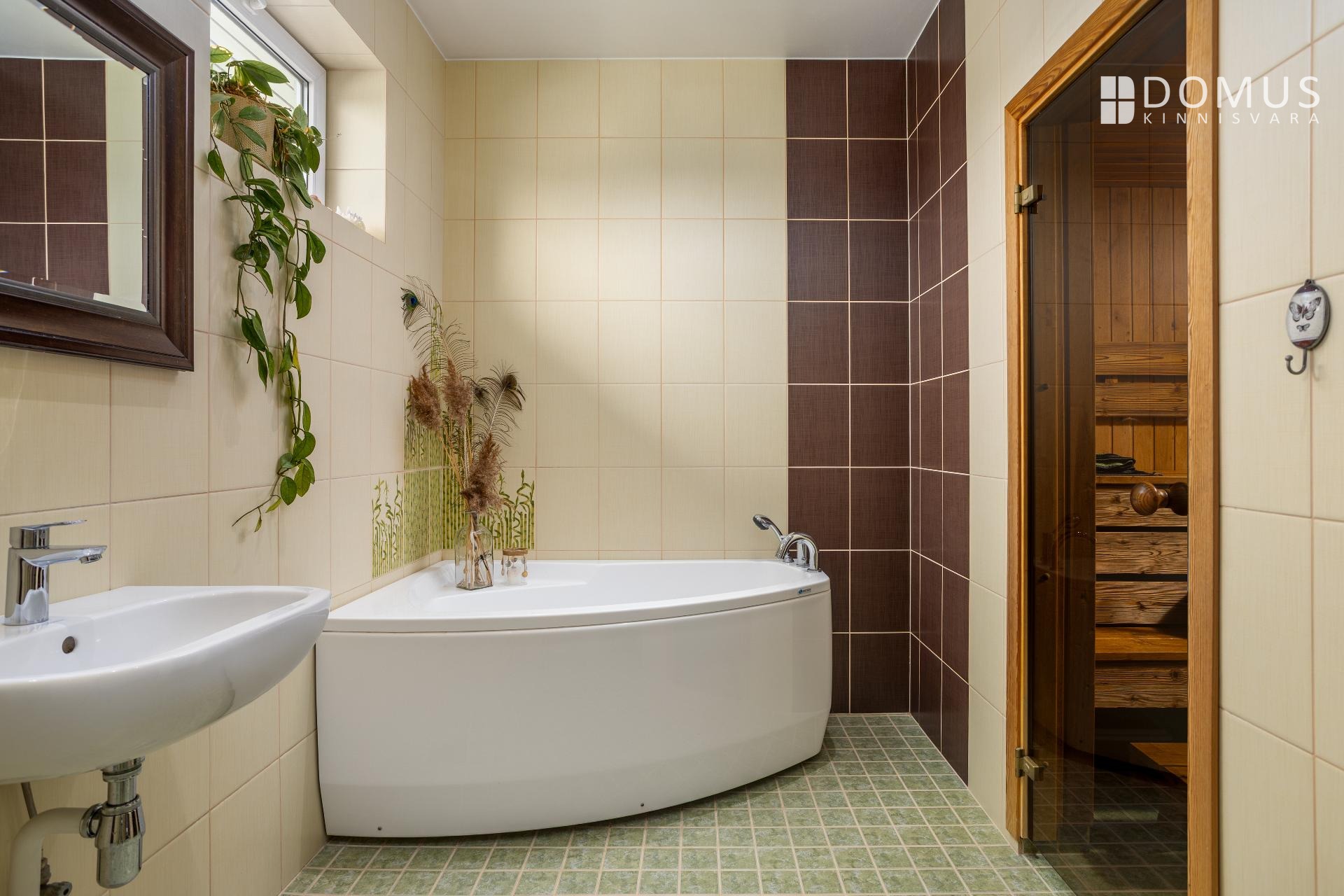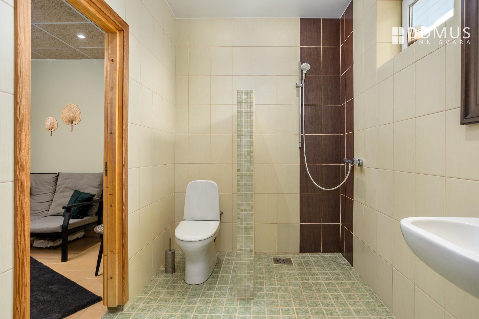 На этом же уровне расположены три спальни, сауна с душевой, отдельный WC, гараж и подсобные помещения. На втором этаже находится просторная спальня с гардеробной, уголок для кабинета и недавно обновлённая ванная комната с мансардным окном. Помещения светлые и обеспечивают достаточную приватность для всех членов семьи.