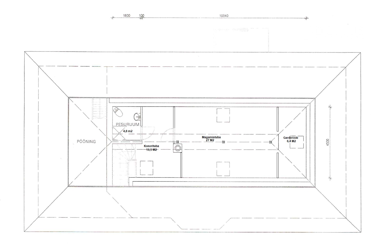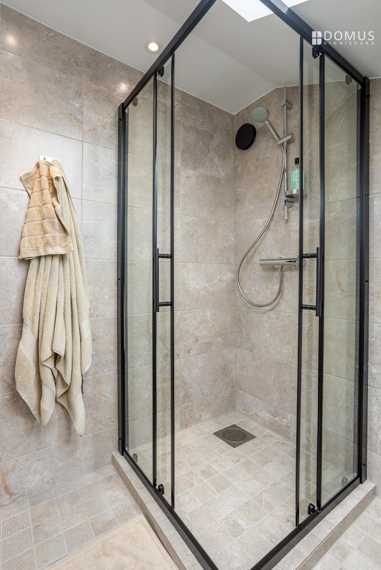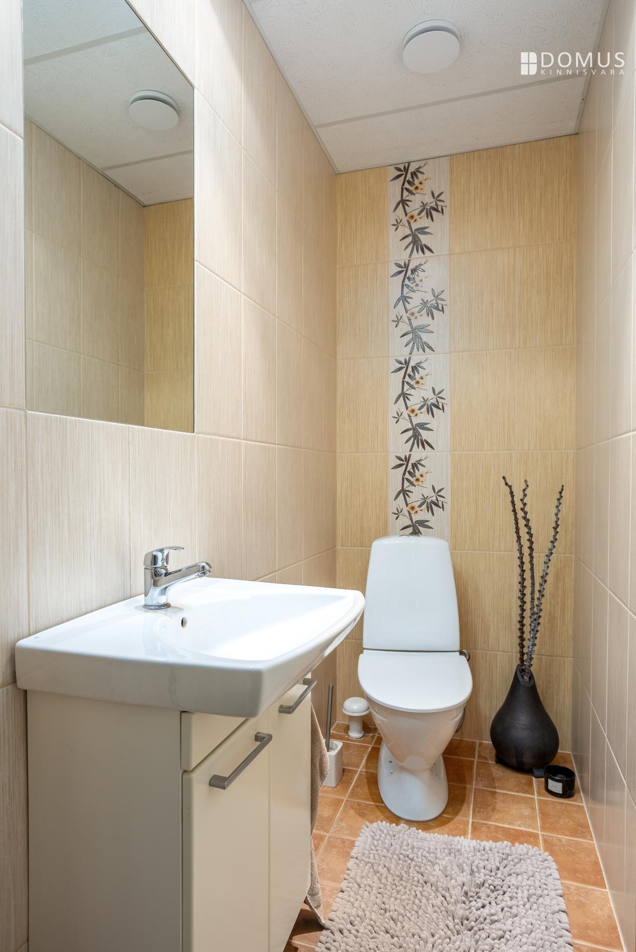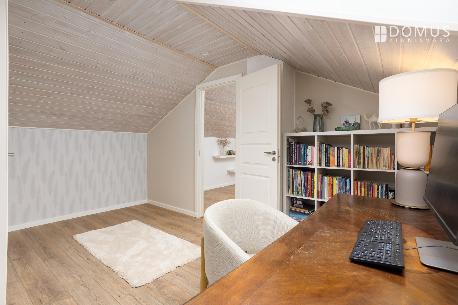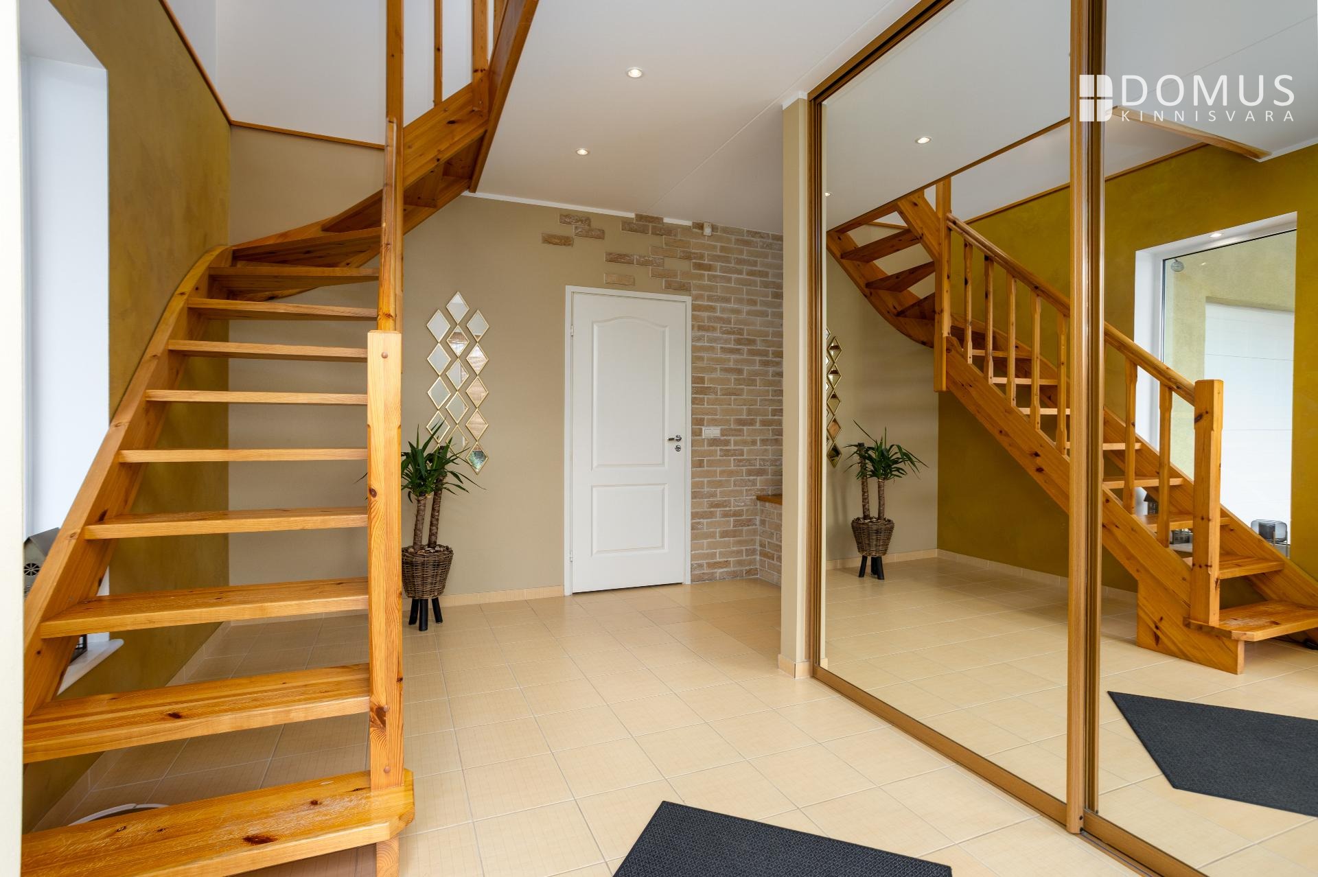 На этом же уровне расположены три спальни, сауна с душевой, отдельный WC, гараж и подсобные помещения. На втором этаже находится просторная спальня с гардеробной, уголок для кабинета и недавно обновлённая ванная комната с мансардным окном. Помещения светлые и обеспечивают достаточную приватность для всех членов семьи.