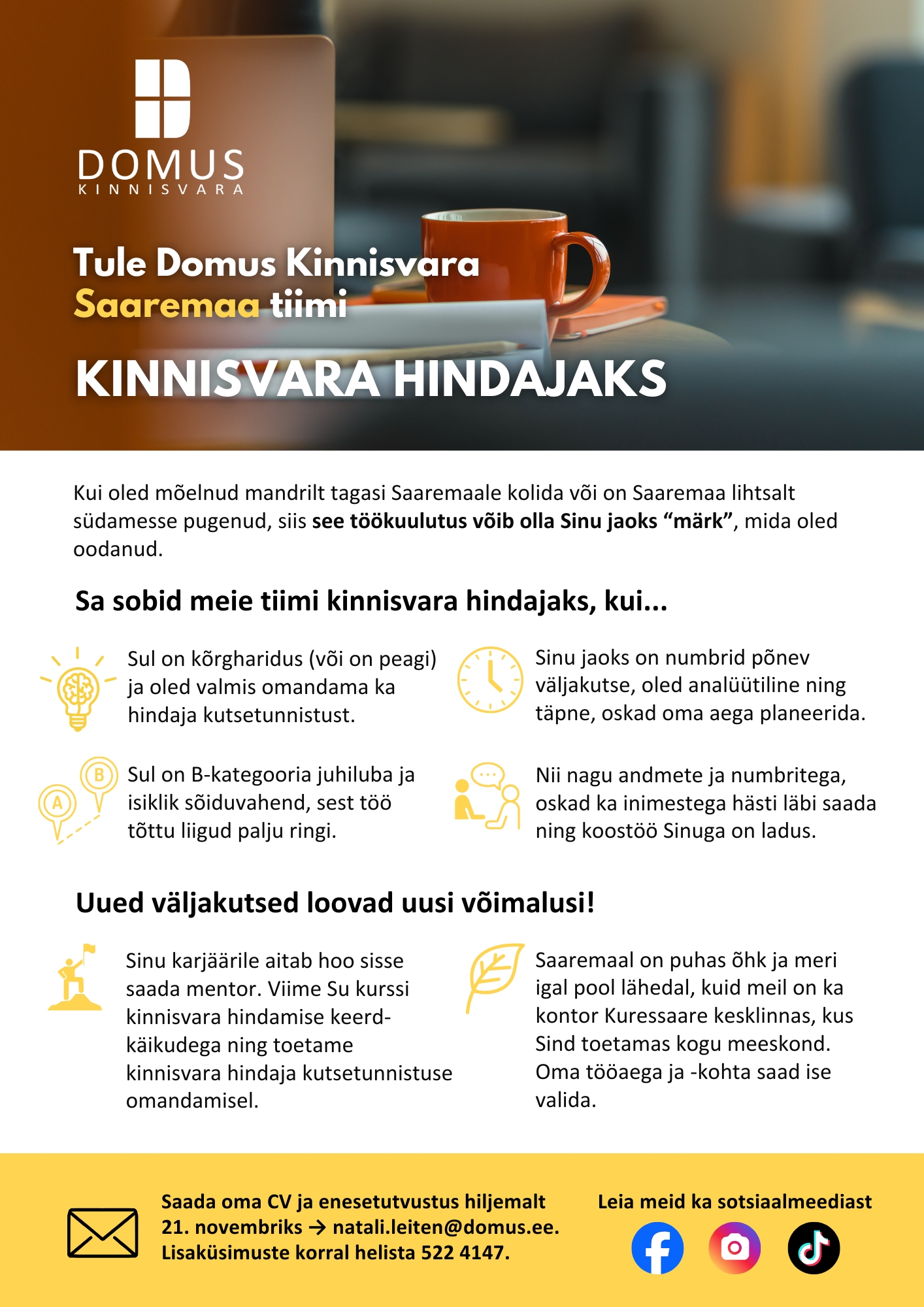 Tule meie Saaremaa meeskonda kinnisvara hindajaks!